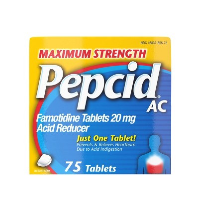 It is used to treat syndromes caused by lots of stomach acid. Oral dosage OTC product eg Pepcid AC and generic equivalents. Read reviews for Maximum Strength PEPCID AC.